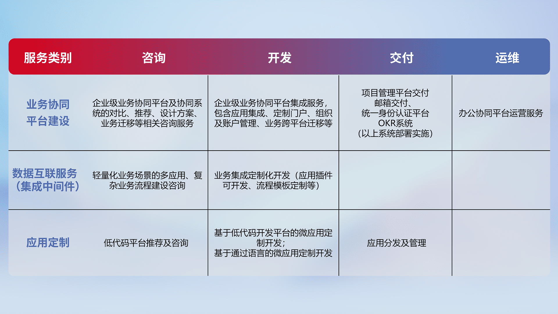 针对钉钉、、、企微、、、、IDaas等平台级产品提供产品的规划、、方案、、、、交付、、、定制化开发等服务,,,实现如统一协同办公、、智能客户服务、、、、混合会议管理、、、智能数据查询、、、等业务场景,,,实现数字化转型。。